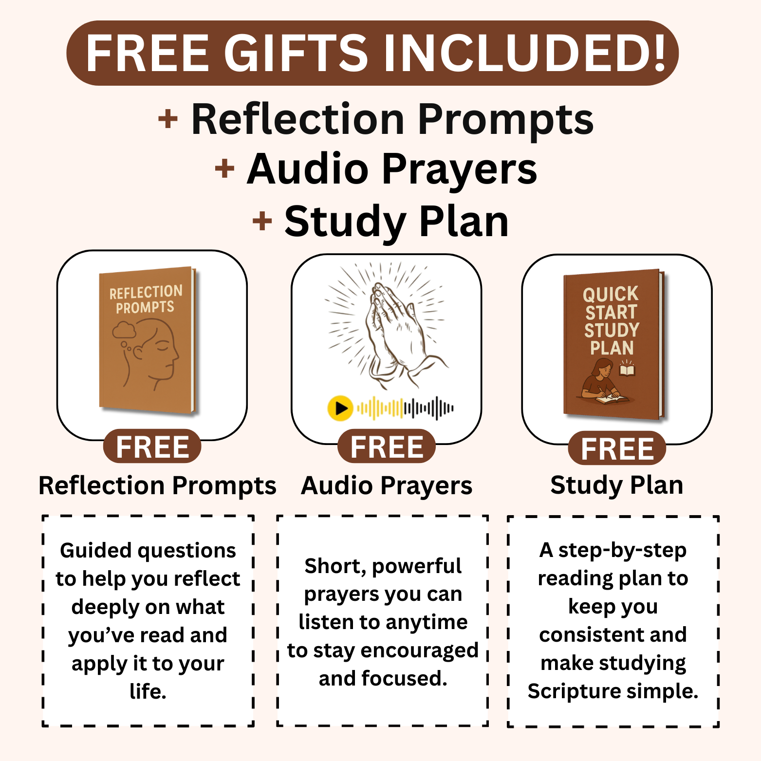 These bonuses are designed to make your Bible study experience easier, deeper, and more enjoyable. They will help you stay consistent and confident as you read God’s Word.